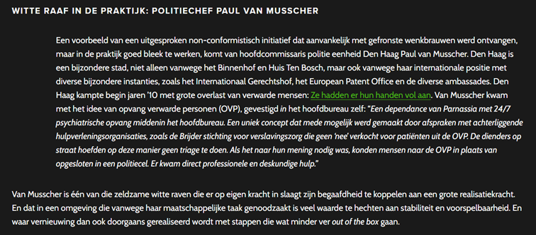 Een voorbeeld van intersectorale samenwerking uit een geheel andere context is onderstaand voorbeeld van politiechef Paul van Musscher, waarin hij een dependance van Parnassia (geestelijke gezondheidszorg) plaatste binnen het hoofdbureau van de Haagse politie.[7]